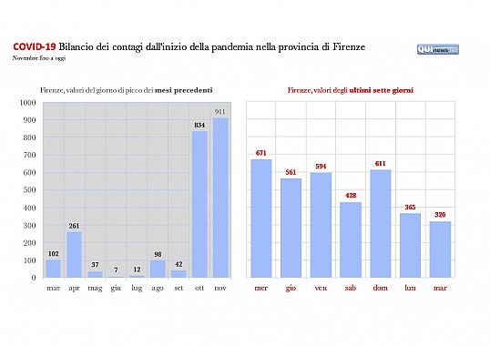Nelle ultime ore la curva flette verso il basso ed un dato significativo è offerto dai numeri che arrivano dal capoluogo con i nuovi casi della sola Firenze che si avvicinano ai 100 nell'arco delle 24 ore, uno dei punti più bassi dalla seconda ondata.