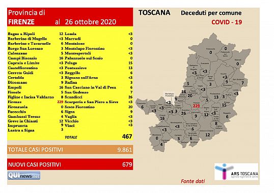 Sono oggi 680 i nuovi casi in provincia di Firenze, di cui 258 in zona empolese. Nel dettaglio le segnalazioni sono giunte da Bagno a Ripoli 11, Barberino di Mugello 5, Barberino Tavarnelle 5, Borgo San Lorenzo 5, Calenzano 13, Campi Bisenzio 27, Dicomano 3, Fiesole 11, Figline e Incisa 8, Firenze 176, Greve in Chianti 4, Impruneta 4, Lastra a Signa 19, Pelago 1, Londa 1, Pontassieve 8, Reggello 8, Rignano sull’Arno 3, San Casciano in Val di Pesa 17, Scandicci 43, Scarperia San Piero 4, Sesto Fiorentino 28, Signa 9, Vaglia 4, Vicchio 5, Castelfiorentino 13, Capraia e Limite 11, Cerreto Guidi 18, Certaldo 21, Empoli 99, Fucecchio 32, Gambassi Terme 6, Montaione 2, Montelupo 25, Montespertoli 12 e Vinci 19.