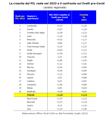 Per crescita del Pil nel 2023 la Toscana si piazza al decimo posto ma lo scarto non è così marcato: a guidare infatti la classifica c'è la Lombardia che segna un +1,29. In coda invece la Basilicata che si ferma al +0,82%.