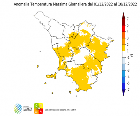 In Toscana le mappature delle anomalie climatiche relative alla settimana fra il primo e il 10 Dicembre vedono sforamenti rispetto alle medie del periodo fino a due gradi specialmente sulle isole dell'arcipelago, sulla costa e sull'area interna centromeridionale del territorio.