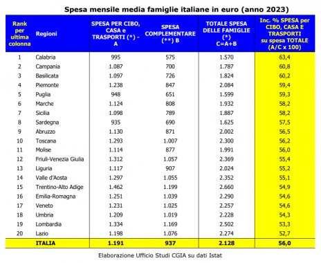 Lo scenario cambia nell'analisi della spesa per casa, trasporti e cibo in valore assoluto. In questo caso la Toscana con i suoi 1.293 euro di spesa media mensile per famiglia è quinta, in una graduatoria in cui svetta il Trentino Alto Adige (1.462 euro) e che vede invece in coda la Sardegna (935 euro). Il tutto a fronte di una media nazionale di 1.191 euro.