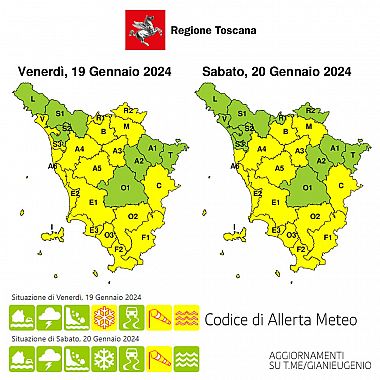 TOSCANA — L'aria rigida tornerà a investire la Toscana dove si accende l'allerta con codice giallo per vento e neve in un fine settimana che sarà tuttavia caratterizzato da cielo sereno: così le previsioni meteo per sabato 20 e domenica 21 Gennaio in arrivo dai meteorologi del consorzio Lamma con allerta diramata per oggi e doman dalla sala operativa regionale di protezione civile.