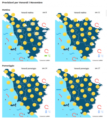 Le mappe meteo che mettono in grafica le previsioni elaborate dal consorzio Lamma sono contraddistinte da simboli del sole a ripetizione per tutti i prossimi giorni da domani a domenica compresa, con qualche velatura il 3 Novembre giusto in area appenninica.